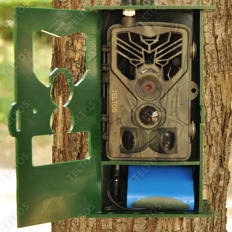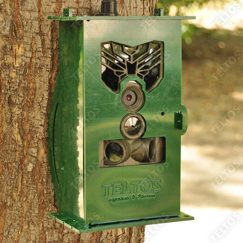 - Во втором случае, когда питание на задней панели (Филин JET) фотоловушки - задний торчащий штекер мешает монтажу фотоловушки на дерево. За счет наших технических решений все эти проблемы решены защитными маскировочными корпусами TELTOS.
